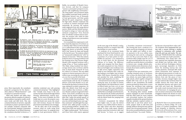 A syndicate of six investment banks purchased the Great Neck bonds for 2.3 % interest. In other words, Levittown paid a premium of 40 basis points( or hundredths of a percent)— 2.7 % compared to 2.3 % in Great Neck— for the perceived riskiness of its bonds. The difference might seem marginal, but these disparities would compound over time. Districts that received higher rates would pay more in debt service; higher repayment costs would in turn diminish their credit rating, leading to even higher rates in future issues. Debt finance rewarded the strong and punished the weak, amplifying the initial wealth disparities over time.