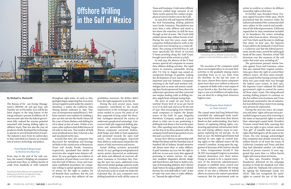 The Bureau of Ocean Energy Management’ s( BOEM) oil and gas lease sale Number 262 in December 2025 will be the latest chapter in the long history of the energy industry’ s pursuit of offshore oil. It was not until 1962 that the federal government fully realized the revenue potential associated with leasing drilling rights to offshore tracts. That was also the year oil producers finally developed the technology to operate in several hundred feet of water. The industry’ s story from its earliest days to that watershed era features an unusual mix of science, technology and politics.