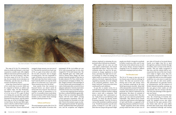 Soon after the financial crisis of October 1847, the overpricing of Consols relative to RA increased. That’ s when Turner acted. He swapped £ 10,000( par value) of Consols for the same amount of RA. His broker dealt with the same jobber for both sides of this swap, which should have minimized brokerage and markup